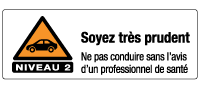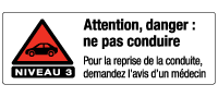 La prise du médicament rend la conduite dangereuse. Avant de recommencer à conduire, demandez l’avis de votre médecin. S’il s’agit d’un médicament sans prescription médicale, demandez l’avis de votre pharmacien.