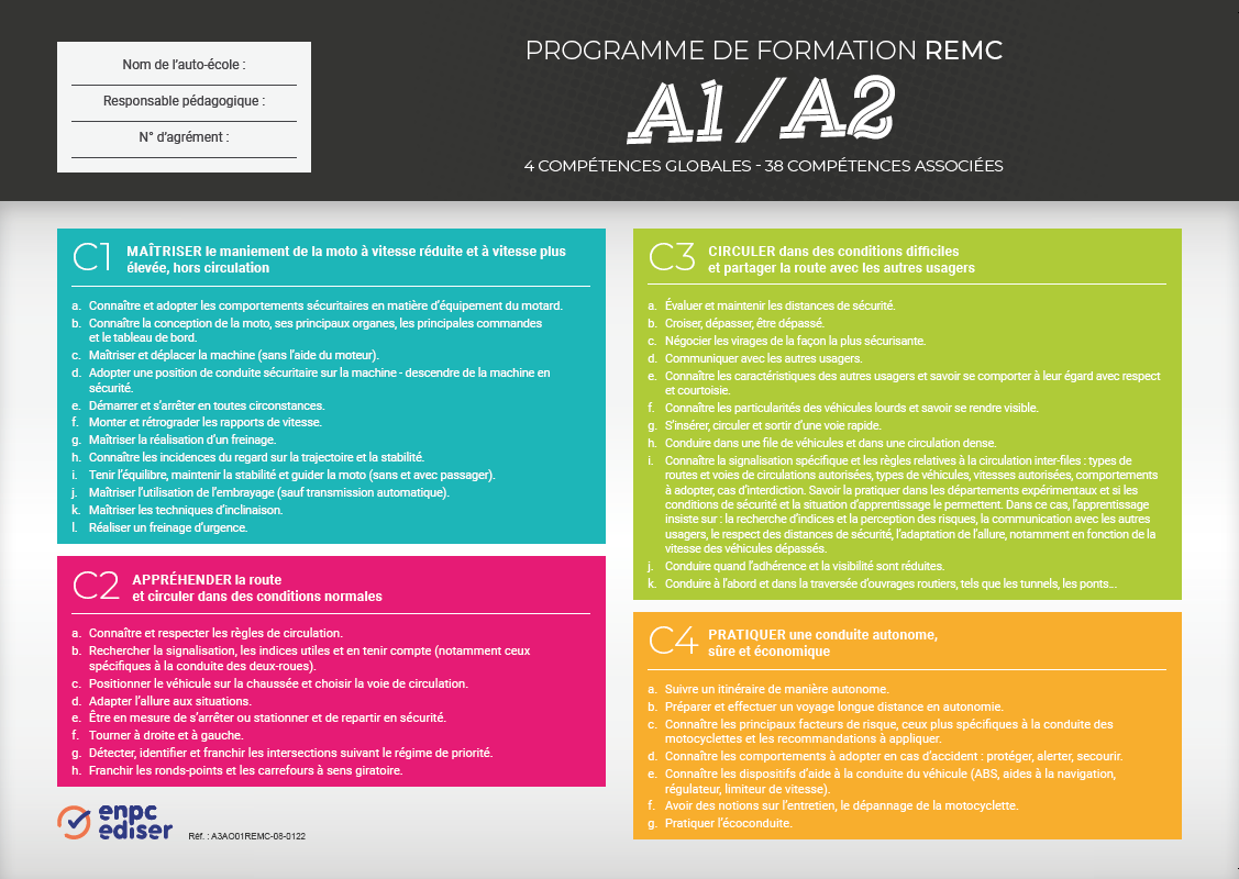 Le candidat doit avoir obtenu son code, le moniteur programme une date d’examen une fois que l’élève aura validé les 4 compétences et sous-compétences du REMC.